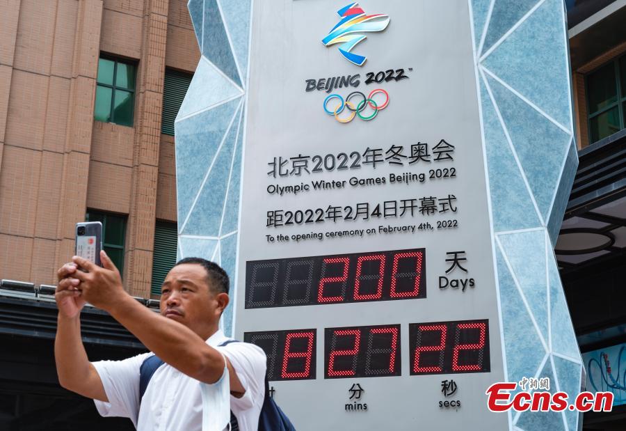 A resident posts for pictures before the countdown clock showing 200 days to go till the opening ceremony of the 2022 Olympic Winter Games at the Wangfujing street, in Beijing, China, July 19, 2021. (Photo: China News Service/ Hou Yu)