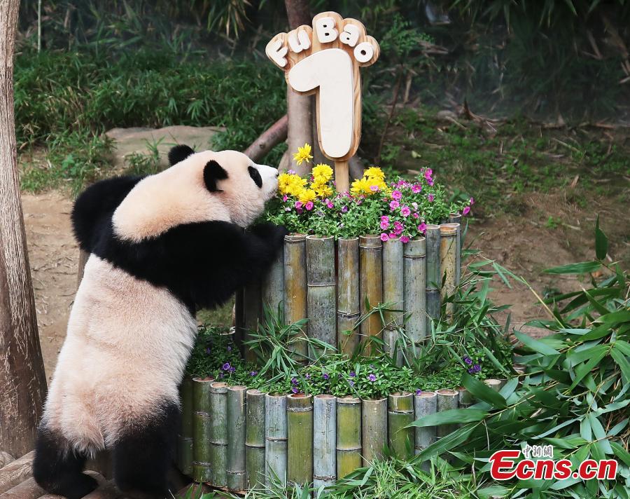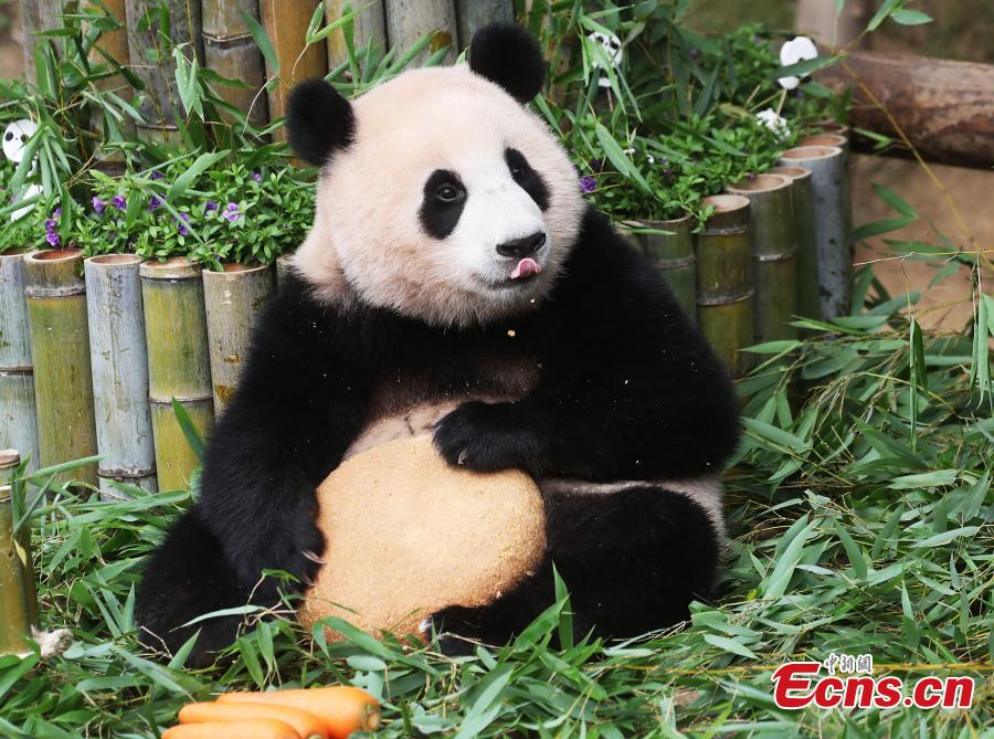 The female giant panda Fubao, the first panda born in the South Korea , welcomes its 1 years old birthday at the Everland theme park in Yongin, South Korea on July 20, 2021. (Photo/ VCG)