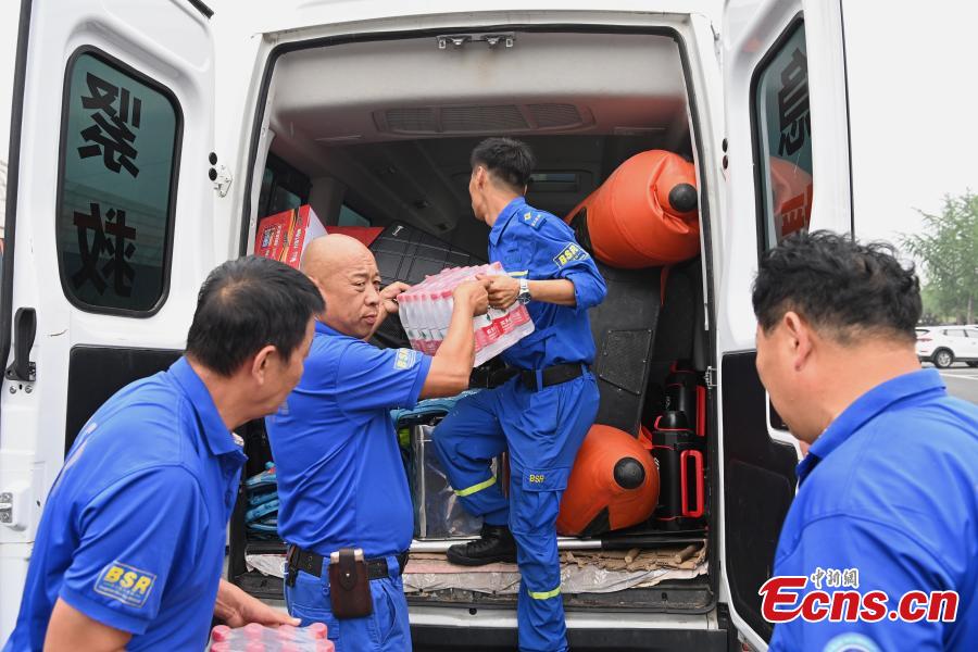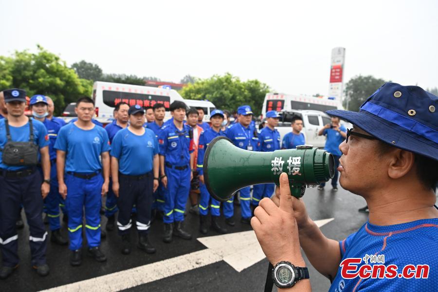 The Blue Sky Rescue(BSR), a nonprofit civil rescue organization in China, assembles at the Doudian rest area on the Beijing-Hong Kong-Macau expressway. The team is ready to help rainstorm-hit Henan Province , July 21, 2021. (Photo: China News Service/ Cui Nan)