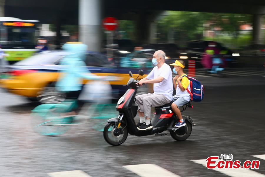 A man takes his child back to school by electric bike in Beijing, June 27, 2022. (Photo: China News Service/Jia Tianyong)