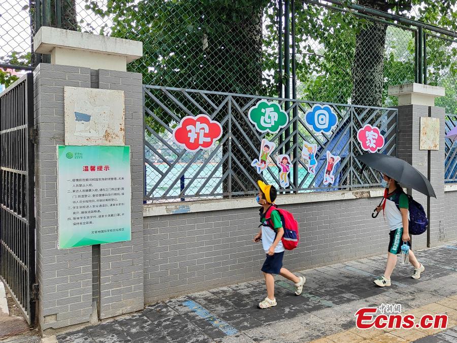 Students from primary to high school returned to campus in Beijing on Monday. Kindergartners will go back to school on July 4.