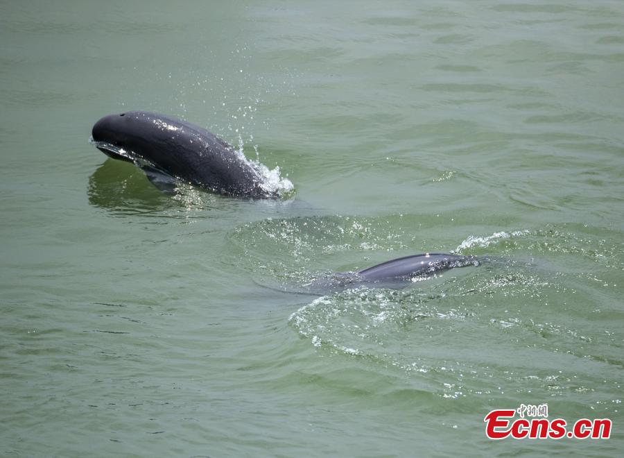Two Yangtze finless porpoises swim in the Yichang section of the Yangtze River, central China's Hubei Province, July 30, 2022. (Photo/VCG)