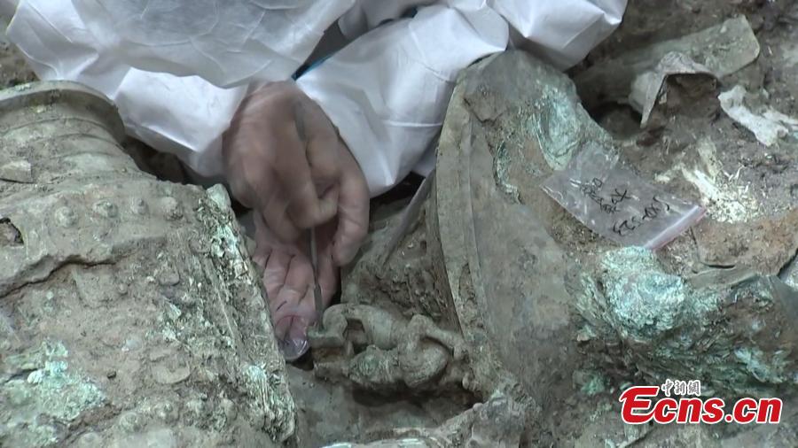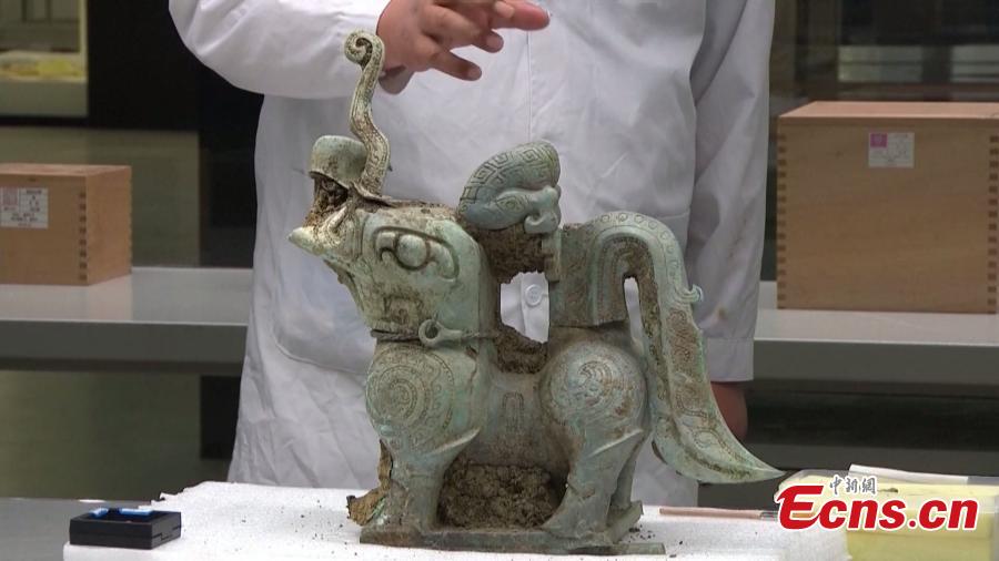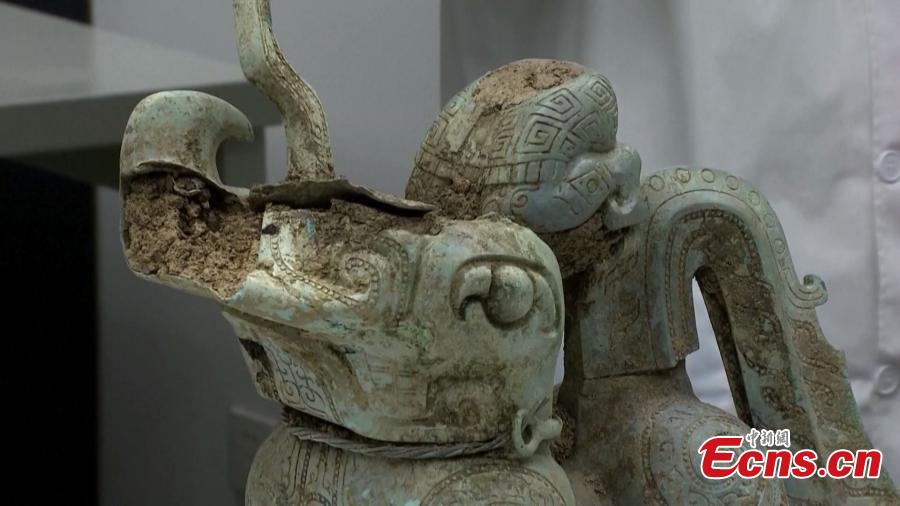 A mythical beast with four wings is unearthed during the most recent excavation of the Sanxingdui Ruins site in Sichuan Province. (Photo/VCG)