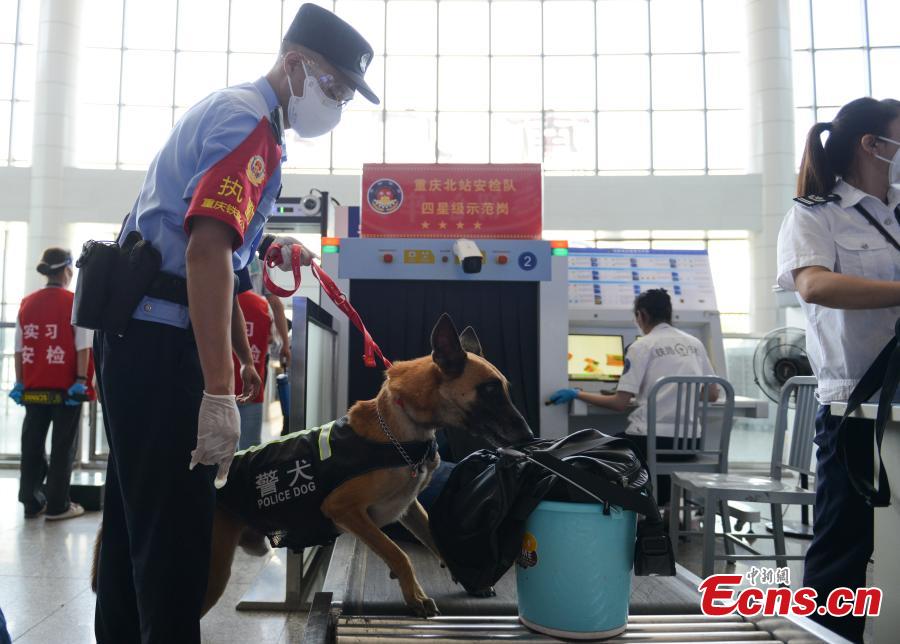 A police dog checks luggage at Chongqing North Station in Chongqing, Aug. 18, 2022. (Photo: China News Service/He Penglei)