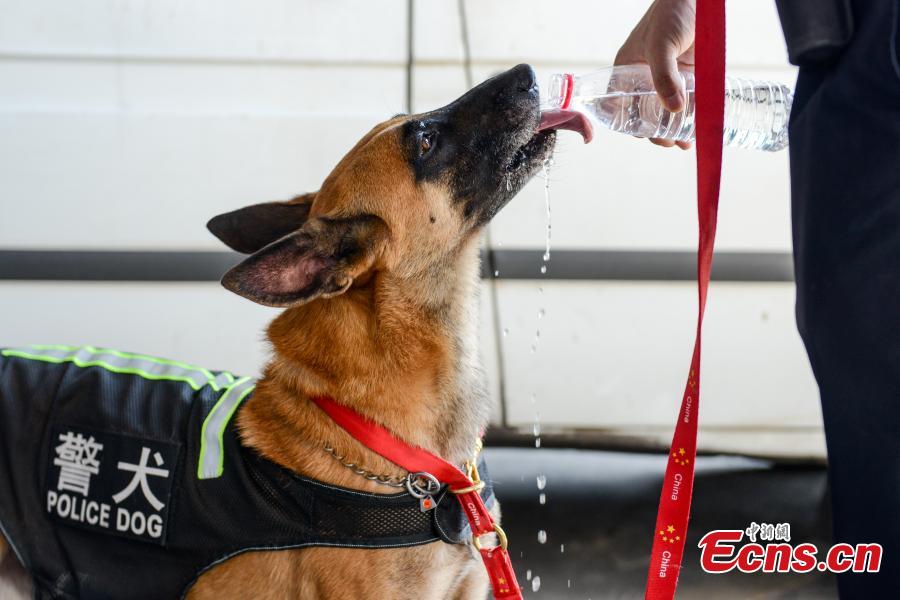 A police dog drinks water during a patrol to beat the summer heat in Chongqing, Aug. 18, 2022. (Photo: China News Service/He Penglei)