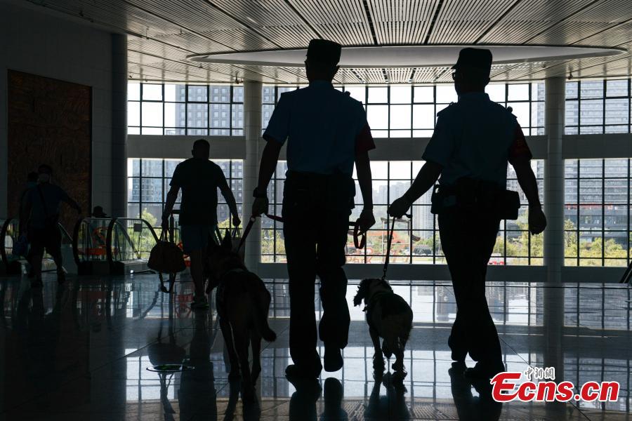 Police dogs wearing cooling vests patrol at Chongqing North Station in Chongqing, Aug. 18, 2022. (Photo: China News Service/He Penglei)