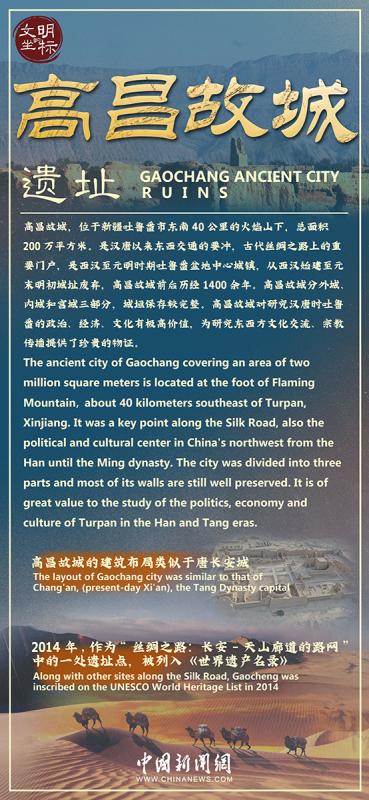 The ancient city of Gaochang covering an area of two million square meters is located at the foot of Flaming Mountain, about 40 kilometers southeast of Turpan, Xinjiang. It was a key point along the Silk Road, also the political and cultural center in China's northwest from the Han until the Ming dynasty. The city was divided into three parts and most of its walls are still well preserved. It is of great value to the study of the politics, economy and culture of Turpan in the Han and Tang eras.
