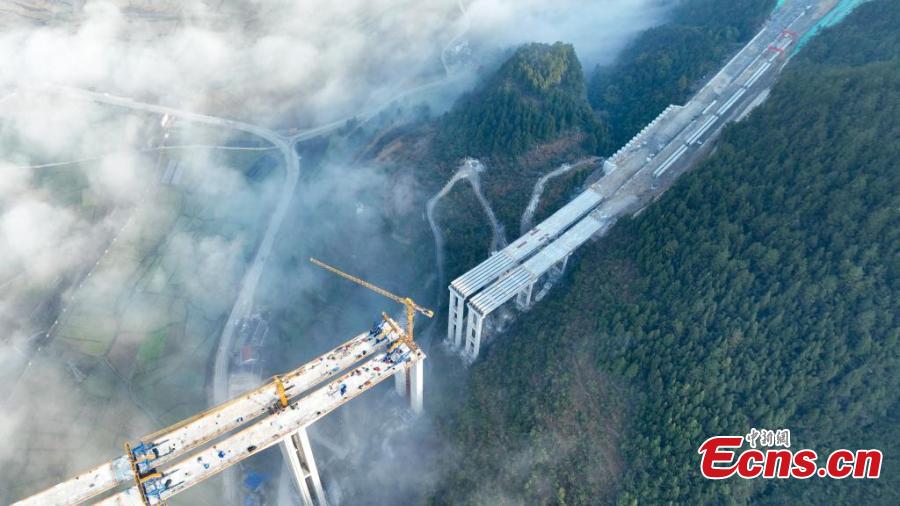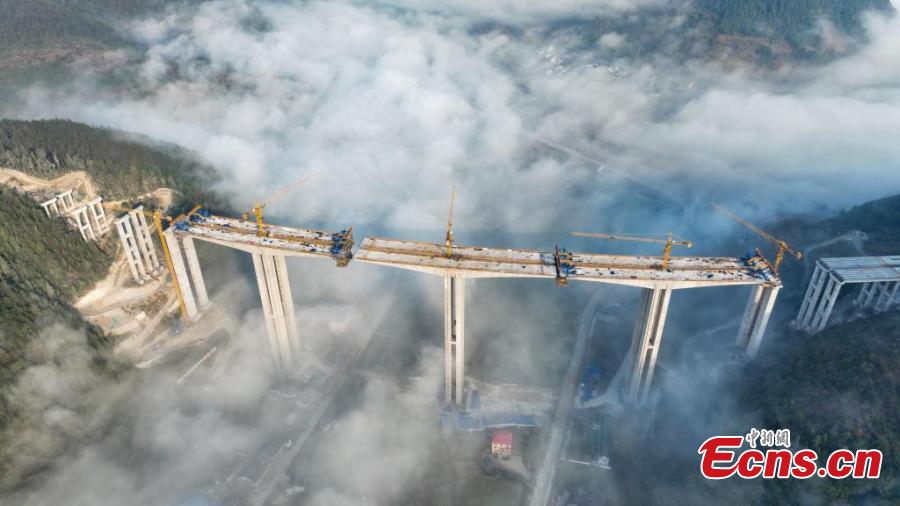 Clouds-shrouded Huangyujiang Bridge is under construction in Zunyi, southwest China's Guizhou Province, Jan. 10, 2023. The bridge, an important part of the Tongzi to Puxin Highway is expected to open to traffic in July 2023. (Photo: China News Service/Li Qianyong)