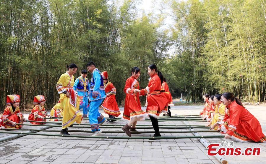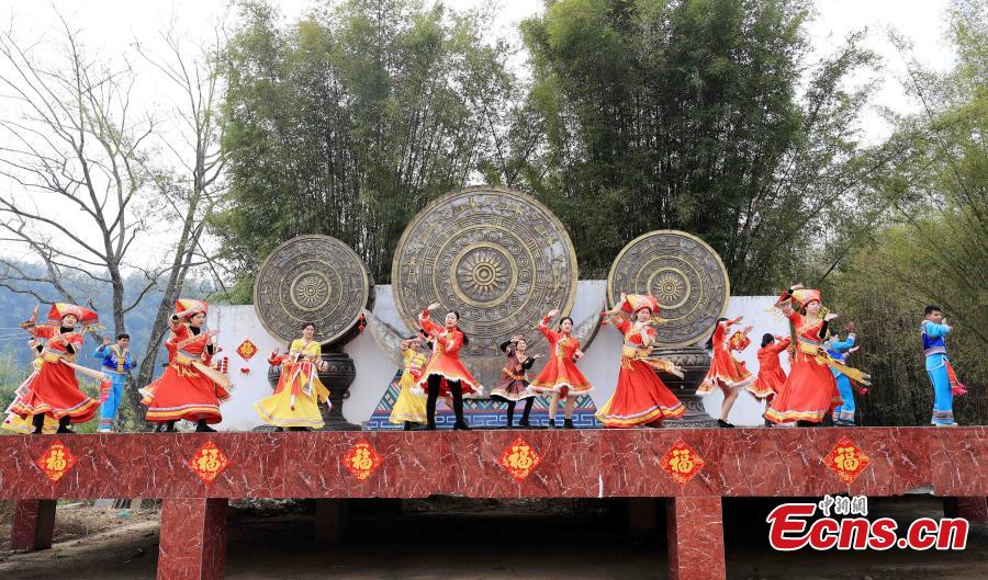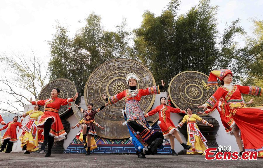People of Zhuang, Miao, Yao and Dong ethnic groups put on their costumes and dance together to welcome Spring Festival, or Chinese New Year, at an village in Rongan county, Liuzhou city, South China's Guangxi Zhuang Autonomous region, Jan. 18, 2023. (Photo: China News Service /Tan Kaixing)