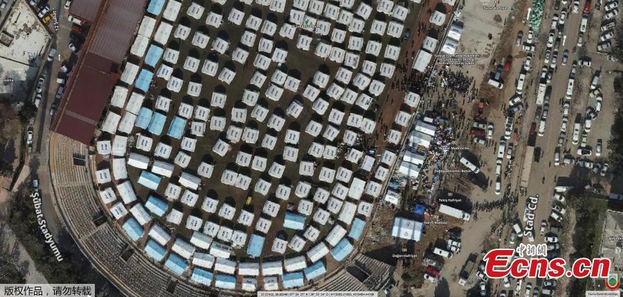 A composite satellite image shows a cluster of AFAD temporary shelter tents in the aftermath of the deadly earthquake in Kahramanmaras, Türkiye, Feb. 13, 2022. (Photo/Agencies)