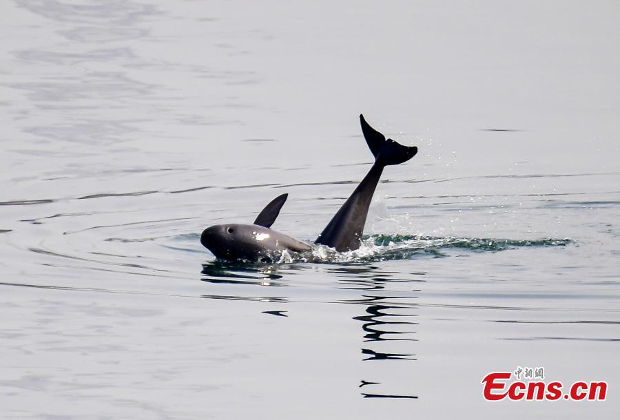 A Yangtze finless porpoise,known as the "giant panda of the water", frolics in the lower reaches of the Yangtze Riverin Yichang, central China's Hubei Province, March 5, 2023. (Photo/VCG)