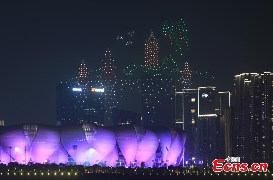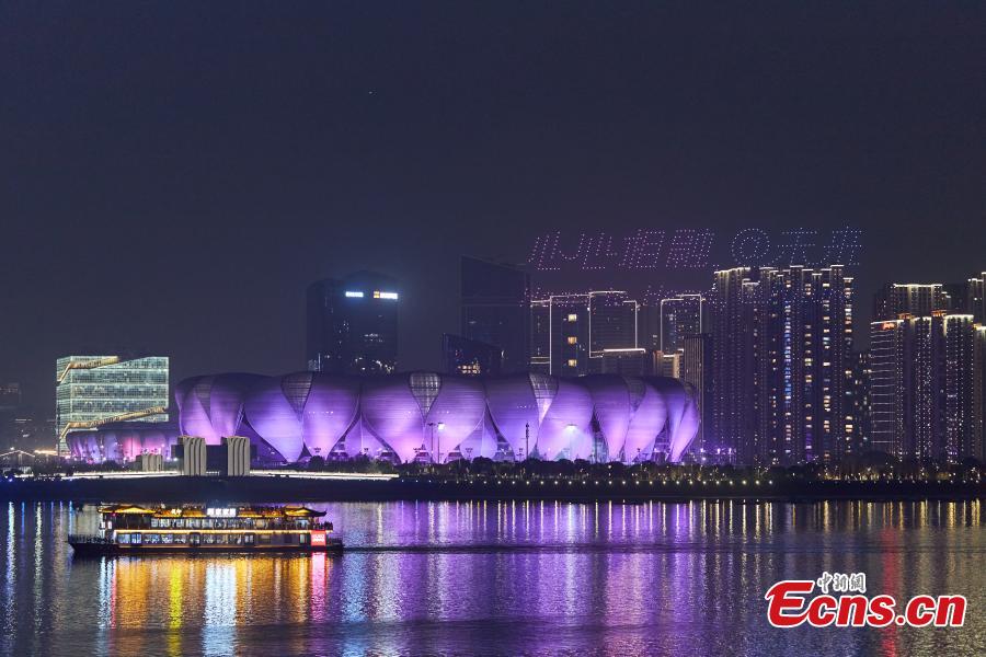 A light show featuring Hangzhou's iconic attractions is staged with 500 drones to mark the 200-day countdown of Hangzhou 2022 Asian Games at Hangzhou Olymic Sports Center Stadium, nicknamed "the Big Lotus", east China's Zhejiang Province, March 7, 2023. (Photo: China News Service/Wang Gang)