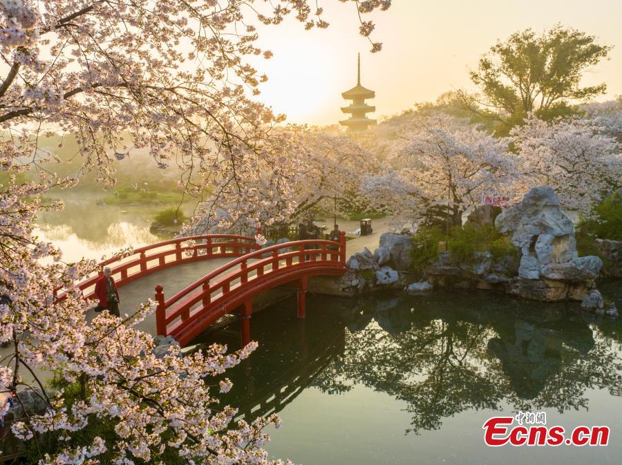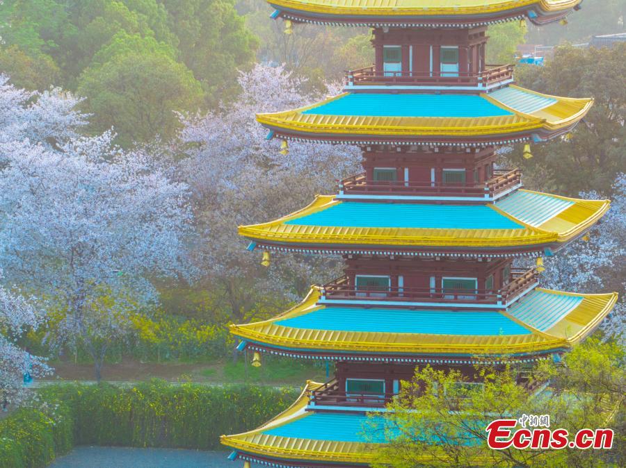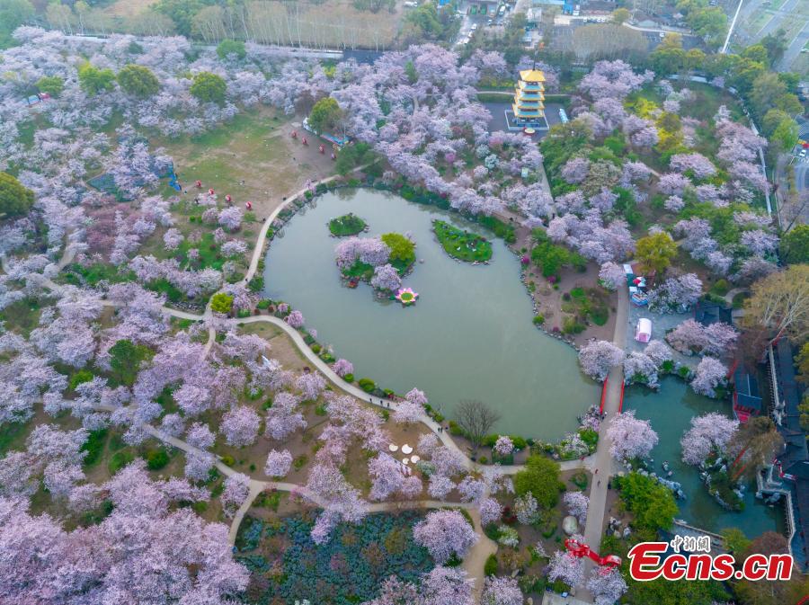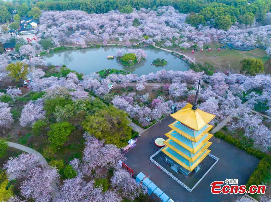Cherry blossoms reach peak bloom at the East Lake, central China's Hubei Province, March 26, 2023. (Photo/VCG)