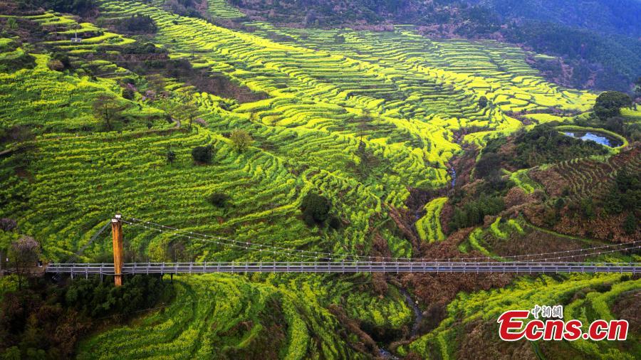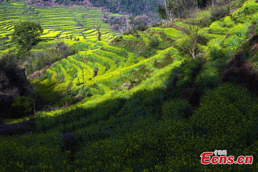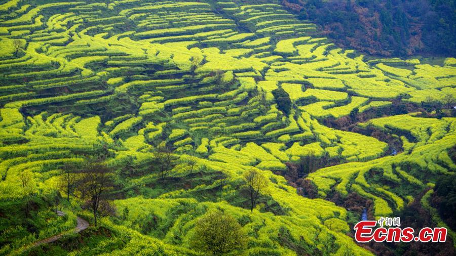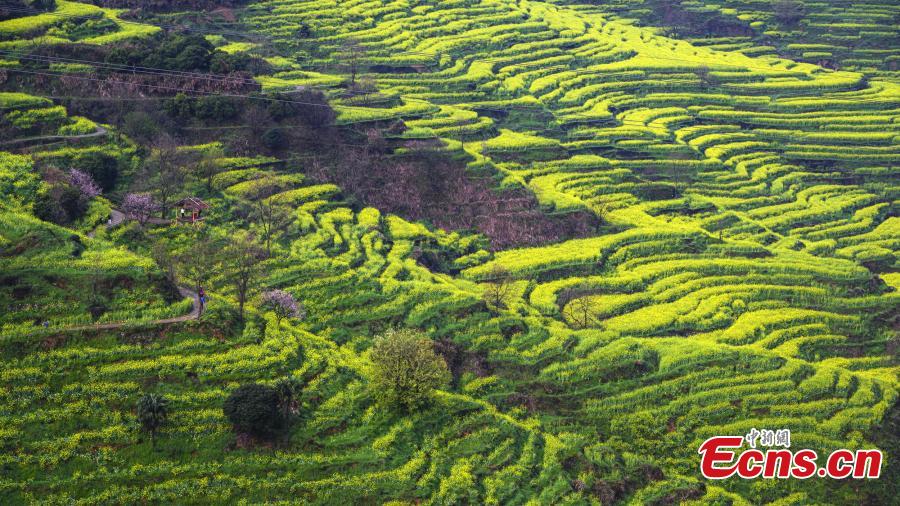 Terraced fields are covered by blooming cole flowers in Shangrao, east China's Jiangxi Province, presenting a spectacular view filled with pastoral beauty, March 26, 2023. (Photo/VCG)