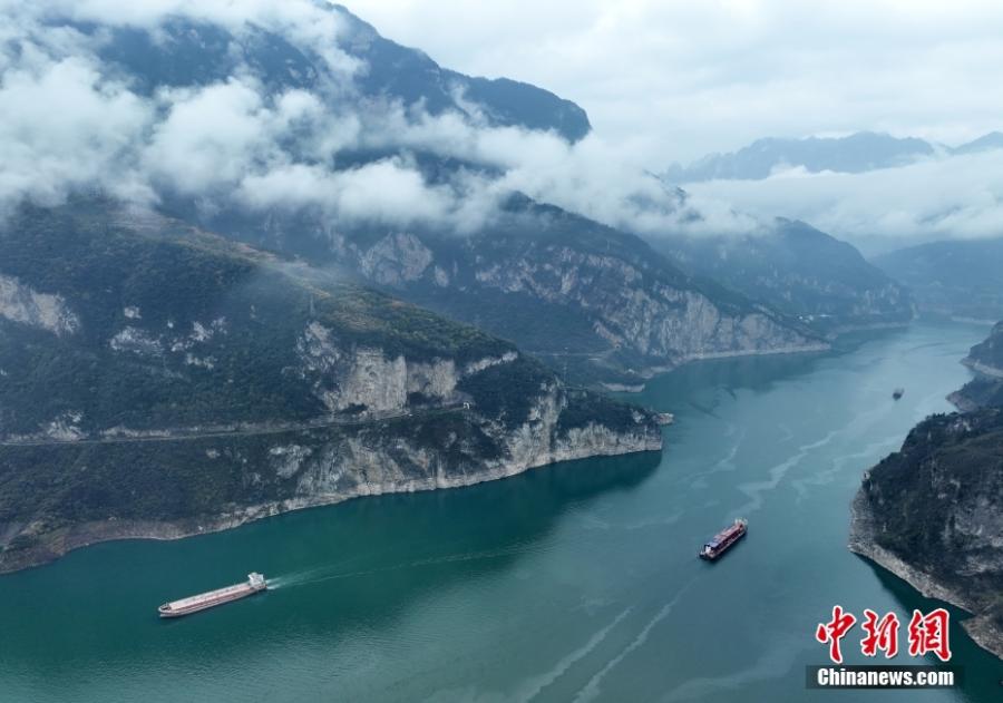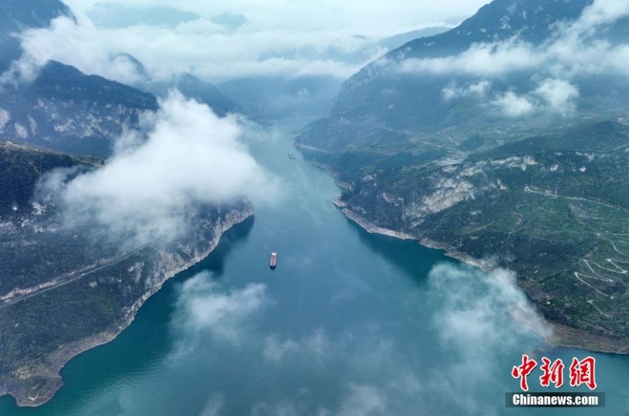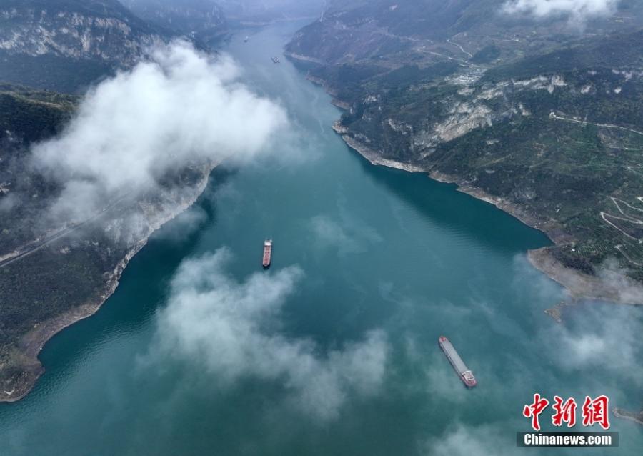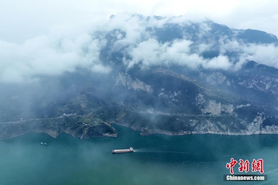 Boats travel pass the mist shrouded Xiling Gorge on the Yangtze River in Zigui County of Yichang, central China's Hubei Province, March 25, 2023. (Photo provided to China News Service)