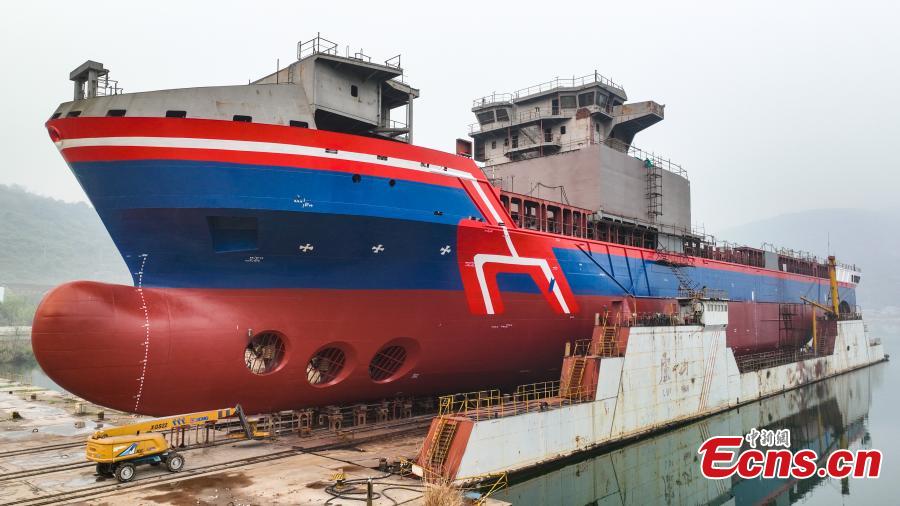 The world's largest and China's 1st 10,000-tonne cable laying vessel, Longyin 9, hits the water in Jiujiang, east China's Jiangxi Province, March 30, 2023. (Photo: China News Service/Wei Dongsheng)
