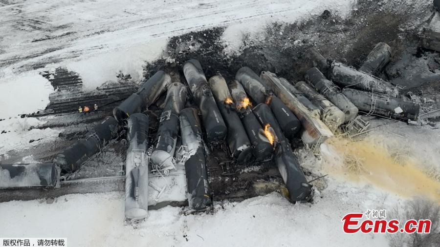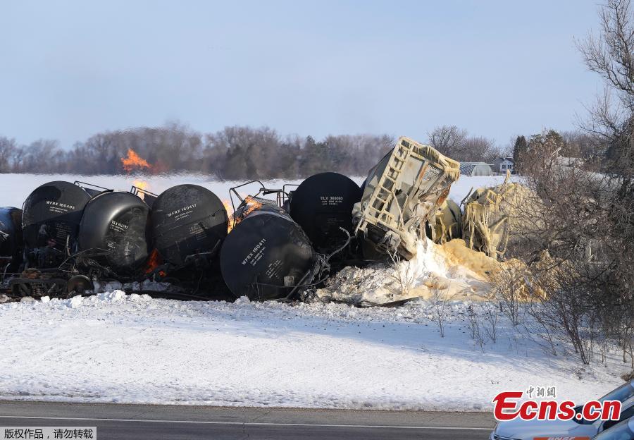 Derailed train cars carrying ethanol erupt in flames in Raymond, Minnesota, U.S., March 30, 2023. (Photo/Agencies)