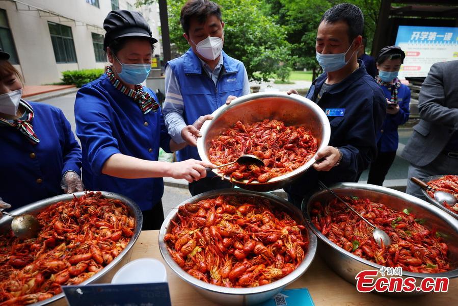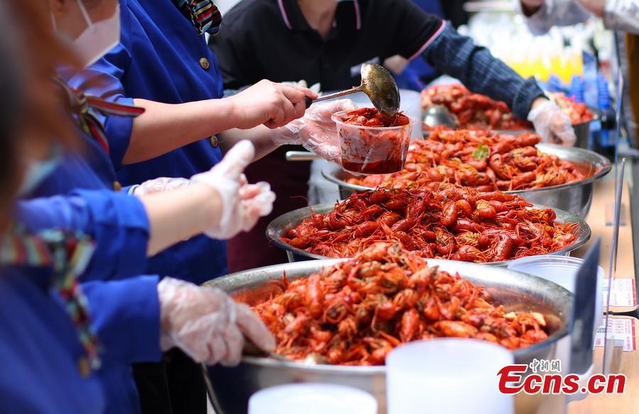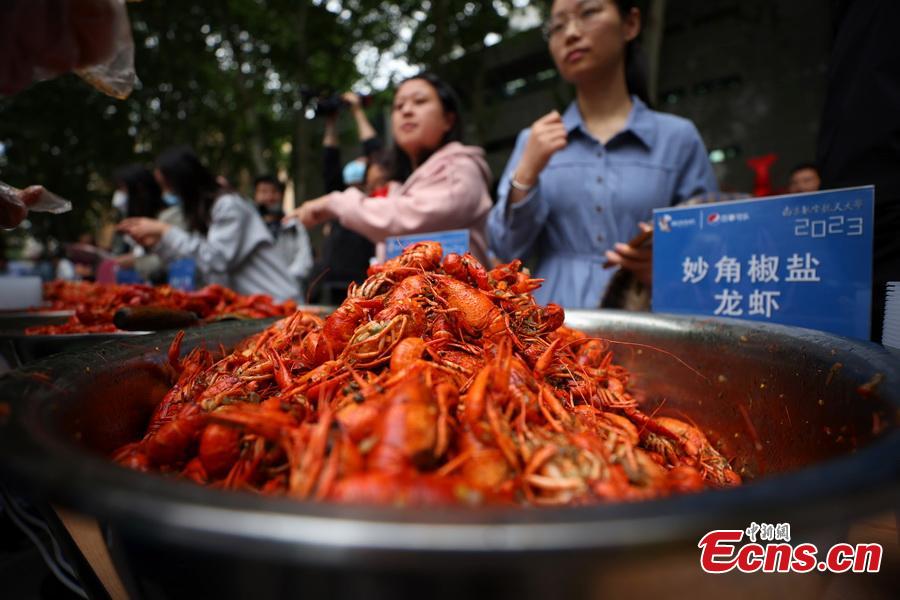 Different flavors of crayfish dishes are offered at Nanjing University of Aeronautics and Astronautics during the crayfish festival held to mark the graduation season in east China's Jiangsu Province, May 10, 2023. (Photo: China News Service/Yang Bo)
