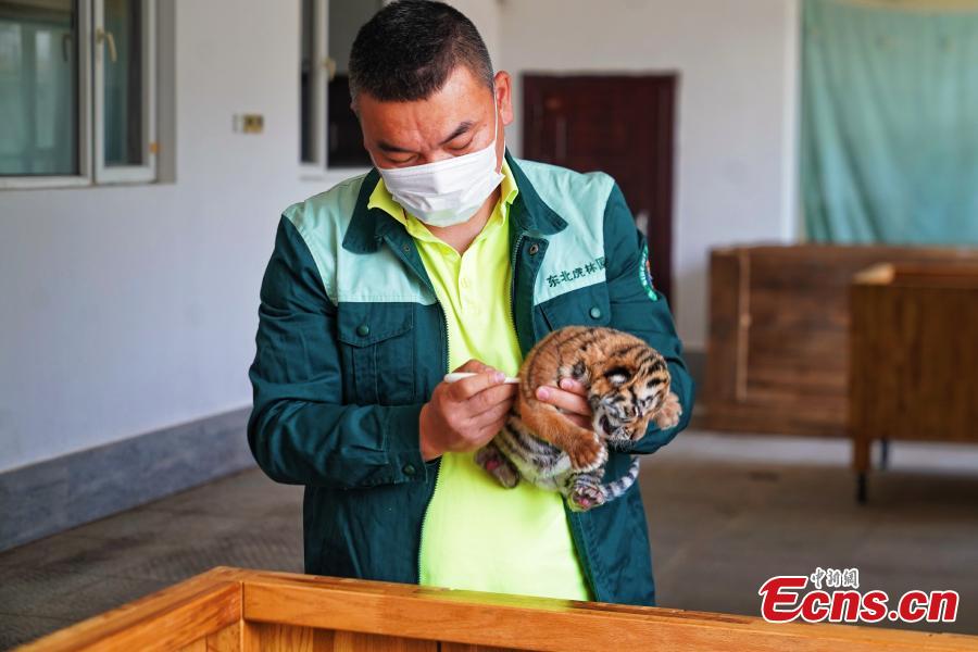 A keeper takes care of a Siberian tiger cub at the Siberian Tiger Park, China's largest Siberian tiger breeding center, in northeast China's Heilongjiang Province, May 11, 2023. (Photo: China News Service/Sun Hanlun)