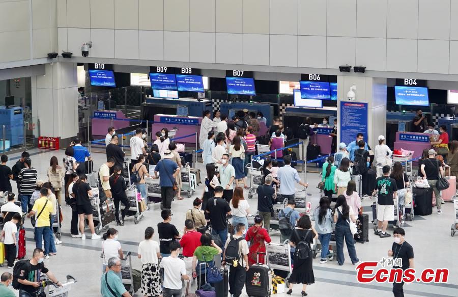 Passengers queue up to check in at the counters of Xiamen Airlines at the Fuzhou Changle International Airport in Fuzhou, east China's Fujian Province, May 22, 2023. (Photo provided to China News Service)