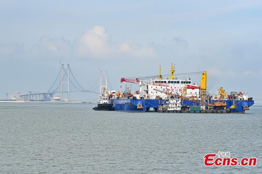 A vessel carrying the last undersea tube berths at the construction site of Shenzhen-Zhongshan Link of the Guangdong-Hong Kong-Macao Greater Bay Area in Shenzhen, south China's Guangdong Province, June 11, 2023. (Photo: China News Service/Chen Jimin)
