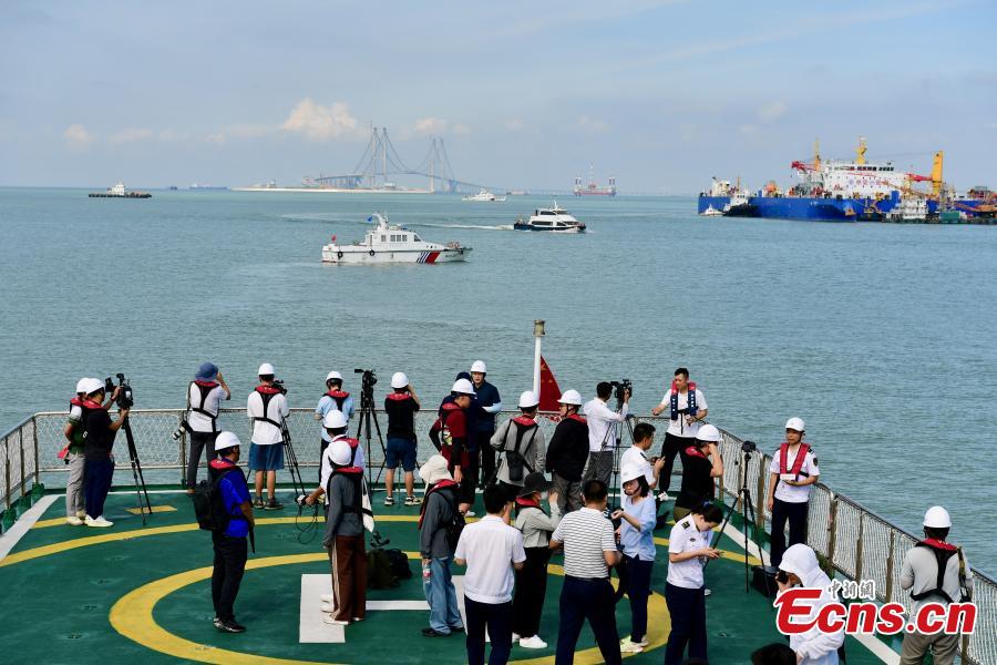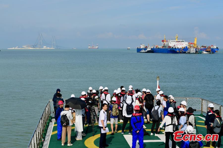 Journalists work at the construction site of Shenzhen-Zhongshan Link of the Guangdong-Hong Kong-Macao Greater Bay Area in Shenzhen, south China's Guangdong Province, June 11, 2023. (Photo: China News Service/Chen Jimin)