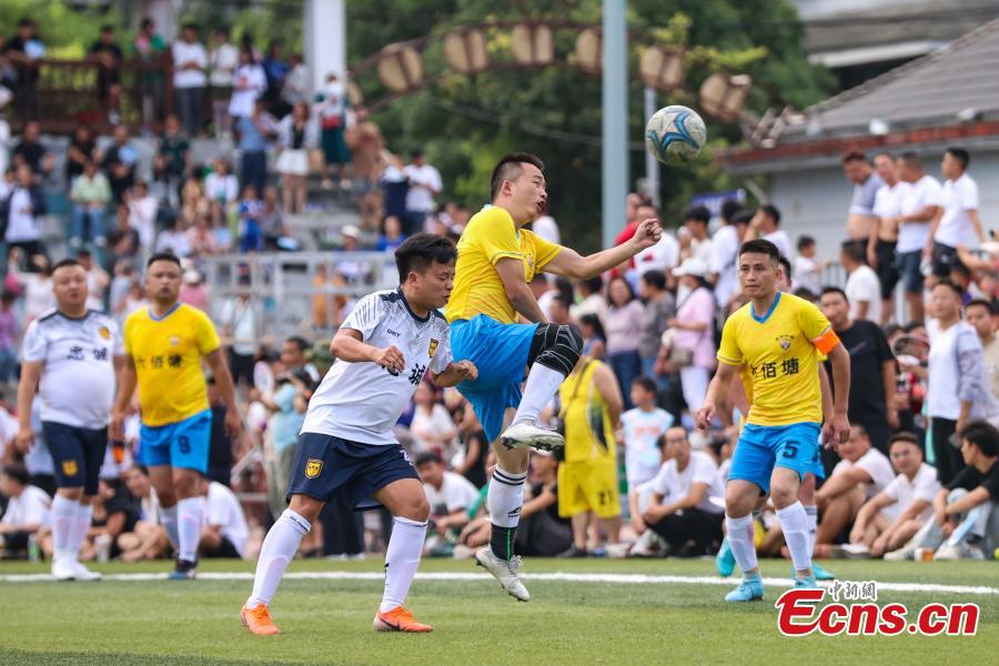 Players compete during a "Village Super League" football match in Rongjiang County, southwest China's Guizhou Province, June 10, 2023. (Photo: China News Service/Qu Honglun)