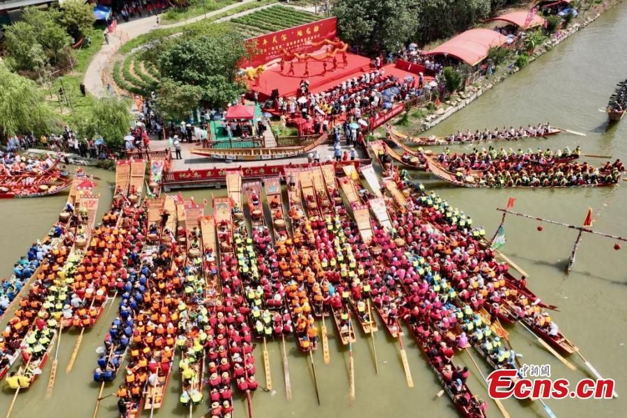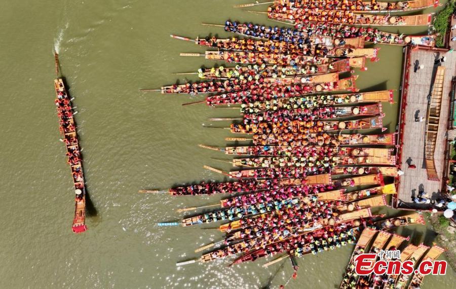 Aerial view shows dragon boats waiting for a race in Putian, east China's Fujian Province, June 12, 2023. (Photo: China News Service/Wang Dongming)