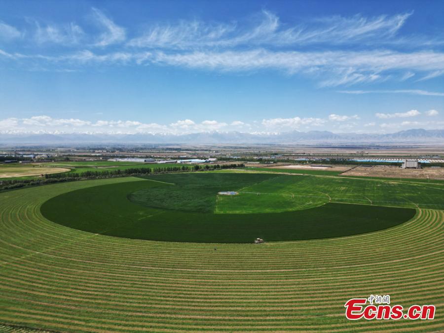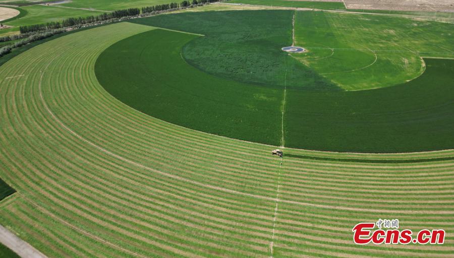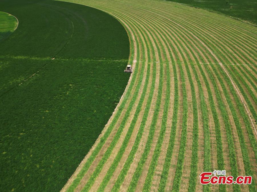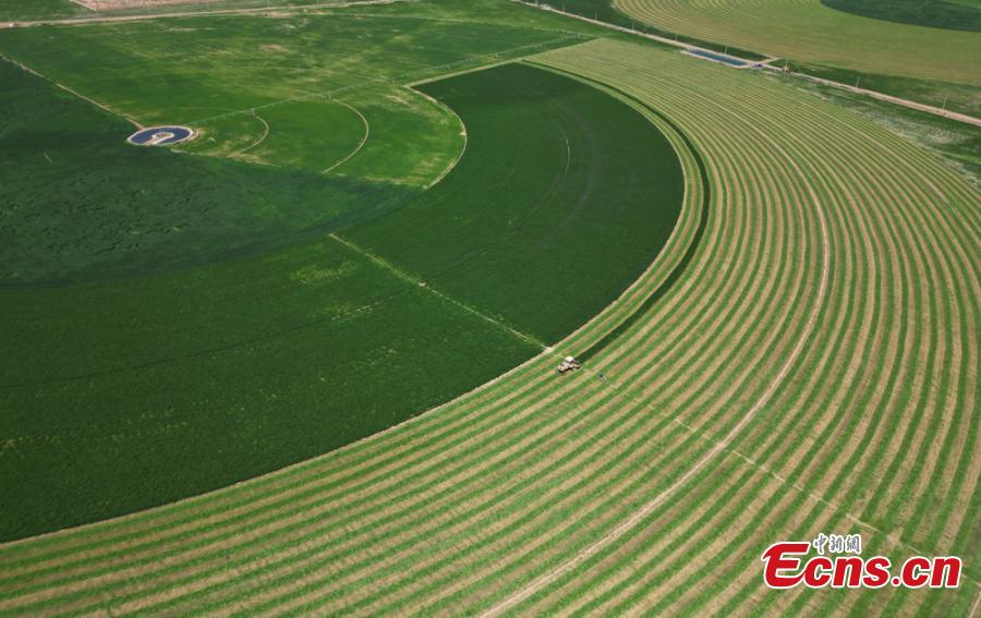 A harvester collects alfalfa at Minle County of Zhangye City, northwest China's Gansu Province. (Photo: China News Service/Yang Yanmin)