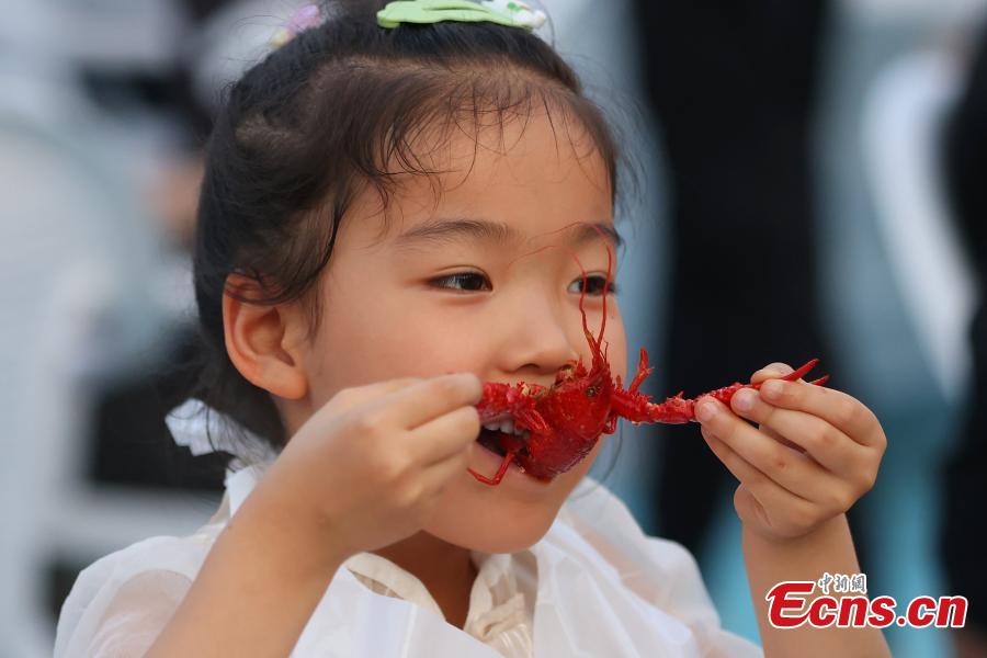 A girl tastes crayfish during the 23rd International Crayfish Festival in Xuyi, east China's Jiangsu Province, June 13, 2023. (Photo: China News Service/Yang Bo)