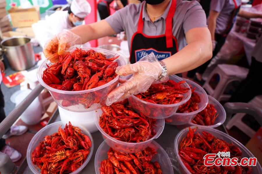 A vendor prepares bowls of crayfish during the 23rd International Crayfish Festival in Xuyi, east China's Jiangsu Province, June 13, 2023. (Photo: China News Service/Yang Bo)