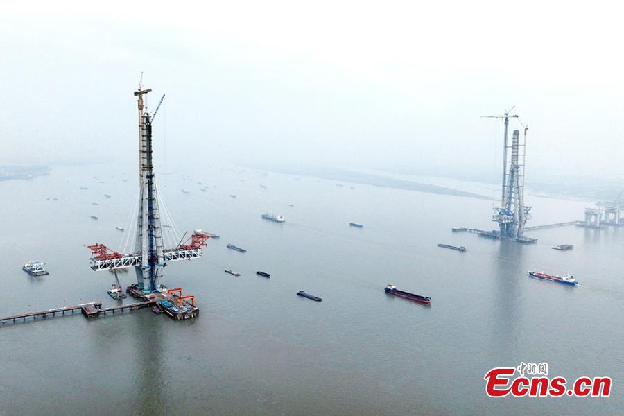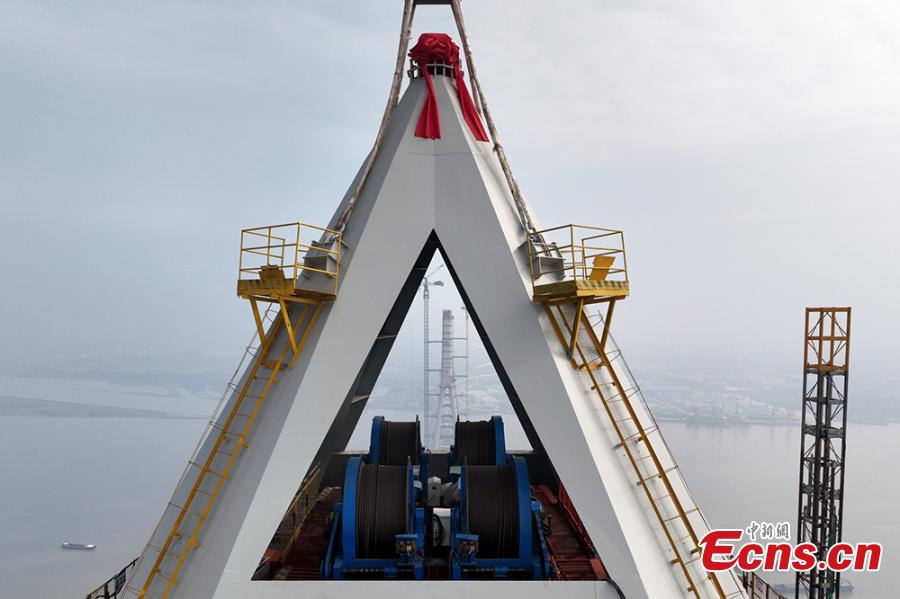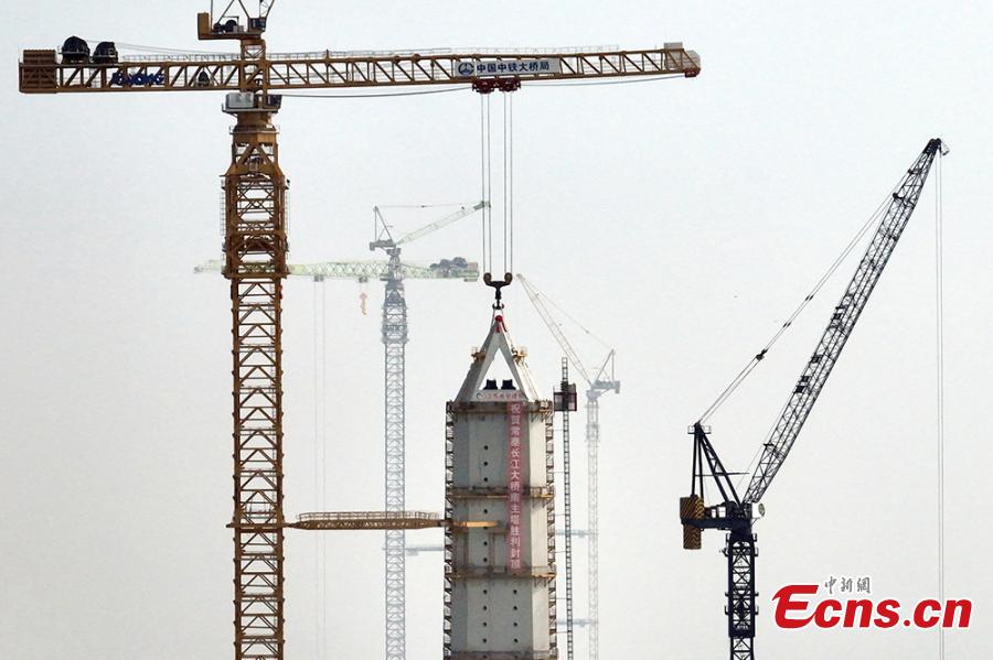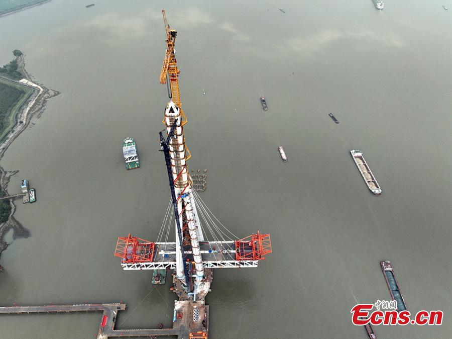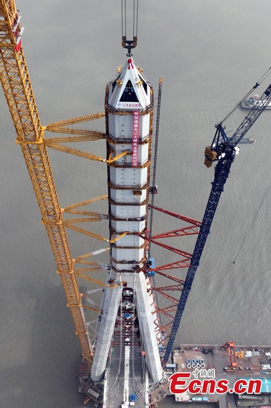 The 350-meter-high tower of the bridge was completed on Tuesday. The Changtai Yangtze River Bridge, which connects the cities of Changzhou and Taixing, is 10.03 kilometers long and world's first river crossing channel integrating expressway, intercity railway and ordinary highway.
