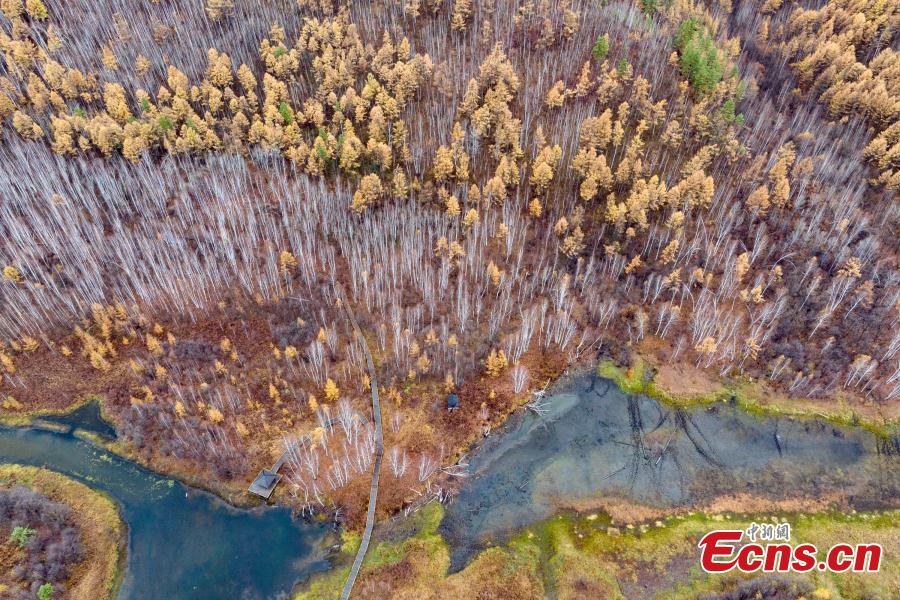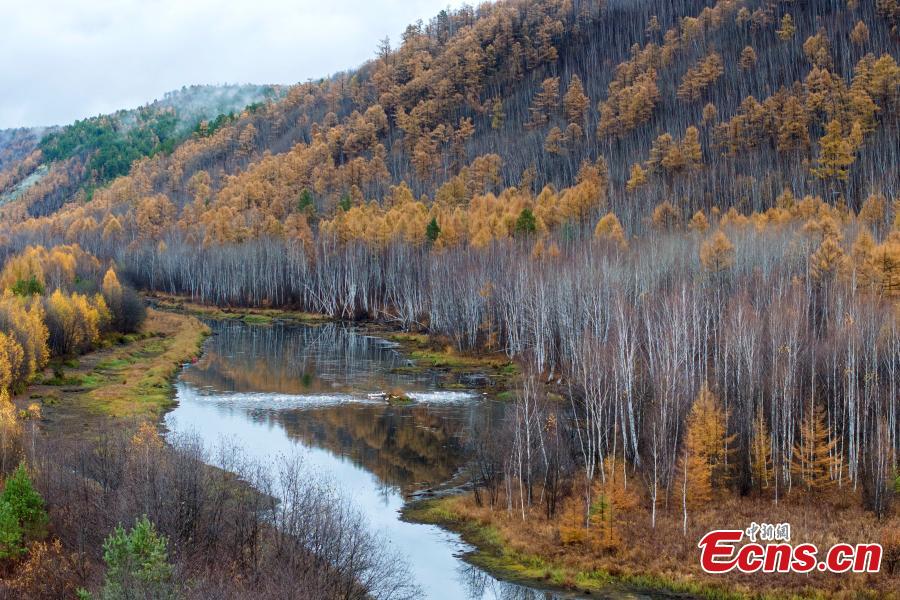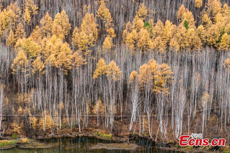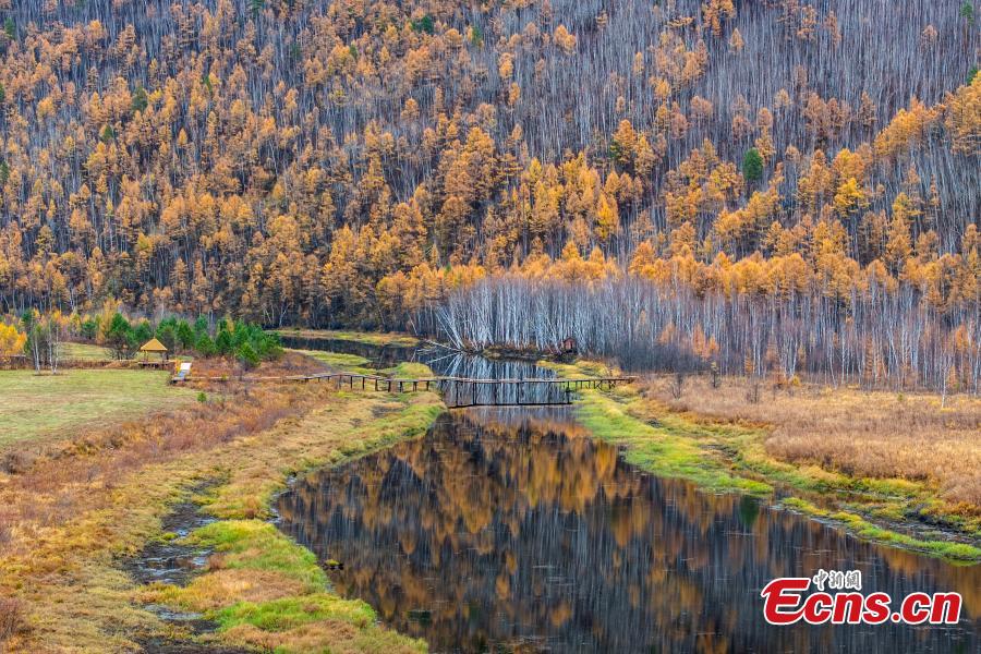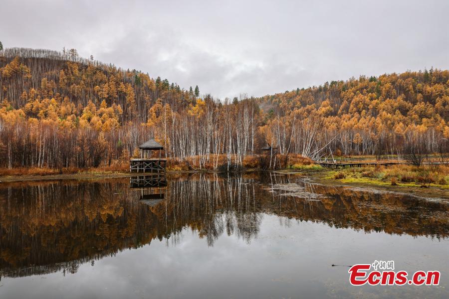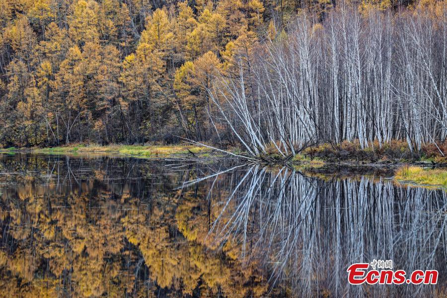 Autumn landscape in the Greater Khingan Range is reflected in a lake, creating a fairy tale wonderland in Beiji village of Mohe city, northeast China's Heilongjiang Province, Sept. 26, 2023. (Photo provided to China News Service)