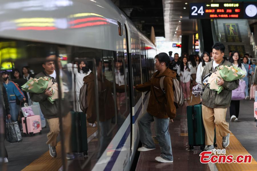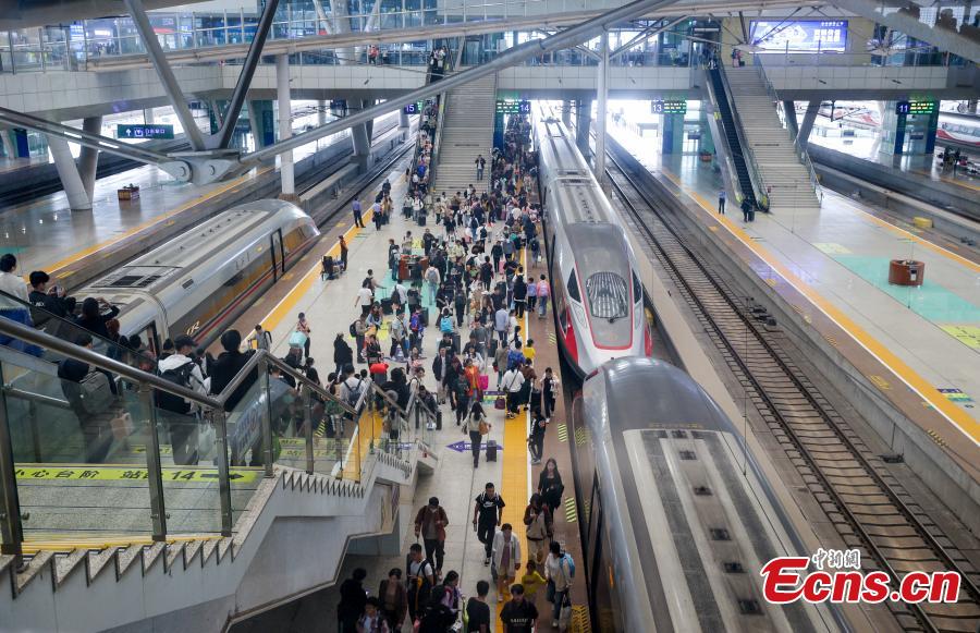 Passengers board a high-speed train at Guiyang north railway station in southwest China's Guizhou Province, Oct. 6, 2023. (Photo: China News Service/Qu Honglun)