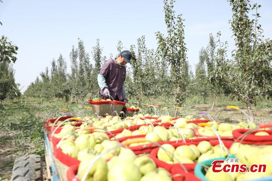 Fragrant pears enter harvest season at Xinjiang Production and Construction Corps, northwest China's Xinjiang Uyghur Autonomous Region. (Photo: China News Service/Wang Wanjun)