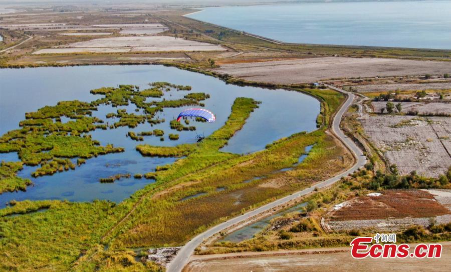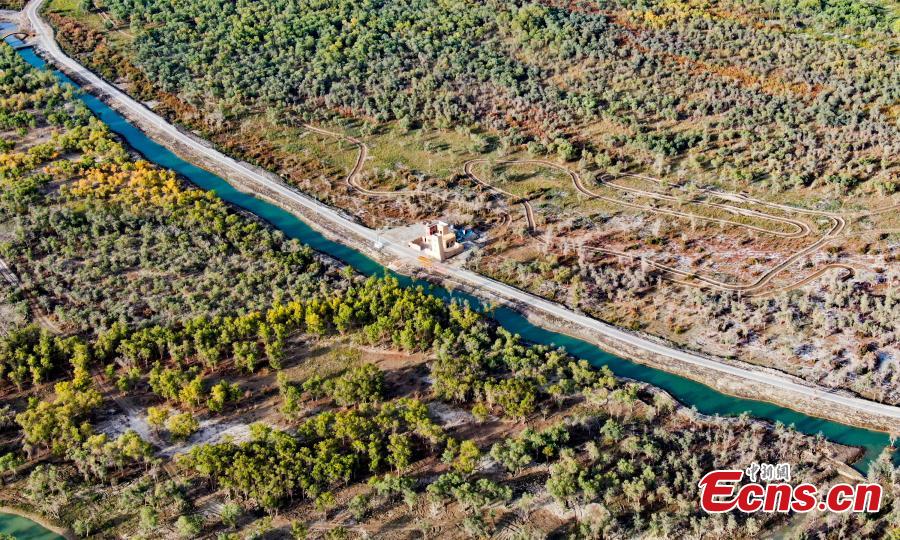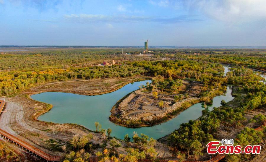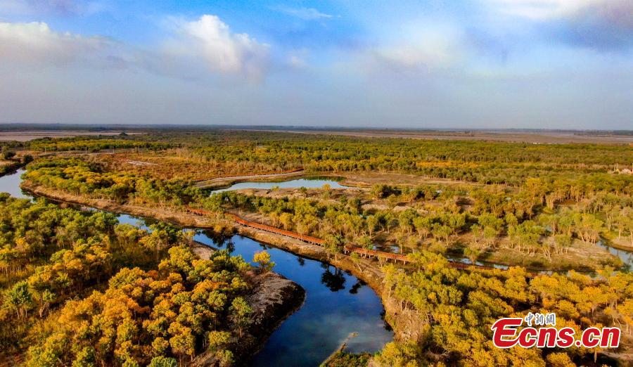 Stunning autumn scenery of desert poplar trees, also known as populus euphratica, along the Tarim River in Xayar County, northwest China's Xinjiang Uyghur Autonomous Region. The populus euphratica forest along the Tarim River, China's longest inland river, is the largest natural forest containing this plant species. (Photo: China News Service/Wang Yanshun)