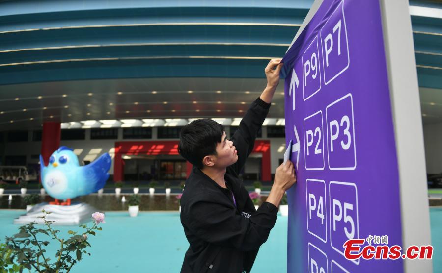 A staff member changes a traffic sign outside Huanglong Sports Center in Hangzhou, east China's Zhejiang Province, Oct. 12, 2023. (Photo: China News Service/Wang Gang)