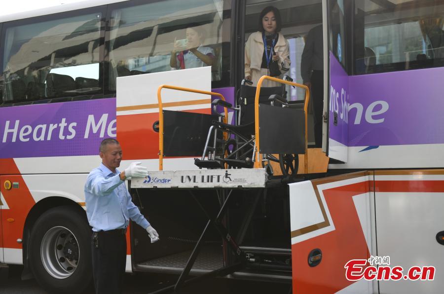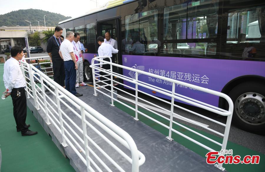 A barrier-free shuttle bus stops outside Huanglong Sports Center in Hangzhou, east China's Zhejiang Province, Oct. 12, 2023. (Photo: China News Service/Wang Gang)