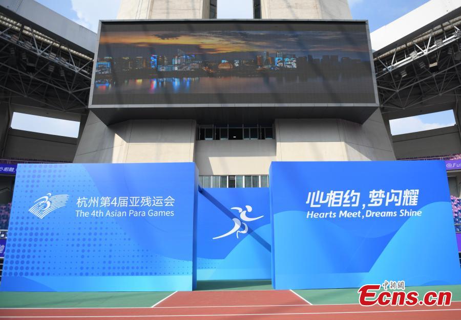 Huanglong Sports Center Gymnasium is decorated with banners for the upcoming 4th Asian Para Games in Hangzhou, east China's Zhejiang Province, Oct. 12, 2023. (Photo: China News Service/Wang Gang)