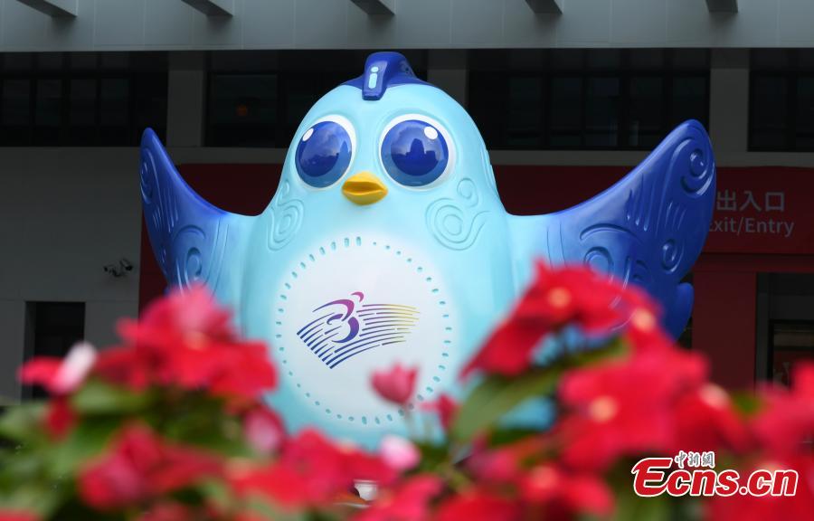 A mascot for the 4th Asian Para Games is installed outside Huanglong Sports Center in Hangzhou, east China's Zhejiang Province, Oct. 12, 2023. (Photo: China News Service/Wang Gang)