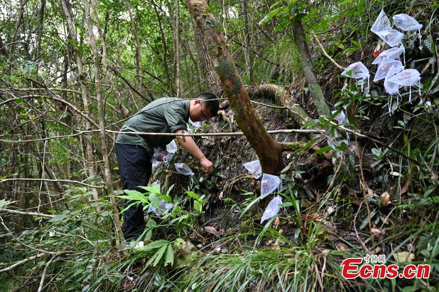 A staff member makes artificial pollination for Paphiopedilum purpureum, a rare wild orchid at Baixi provincial nature reserve in Zijin County, Heyuan city, south China's Guangdong Province, Oct. 12, 2023. (Photo: China News Service/Chen Chuhong)
