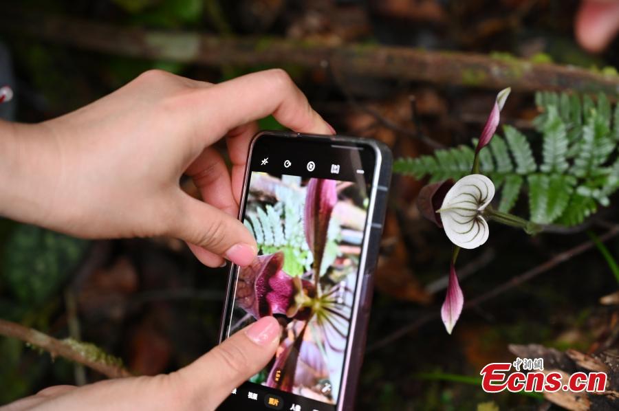 A staff member takes photos a blooming Paphiopedilum purpureum, a rare wild orchid at Baixi provincial nature reserve in Zijin County, Heyuan city, south China's Guangdong Province, Oct. 12, 2023. (Photo: China News Service/Chen Chuhong)