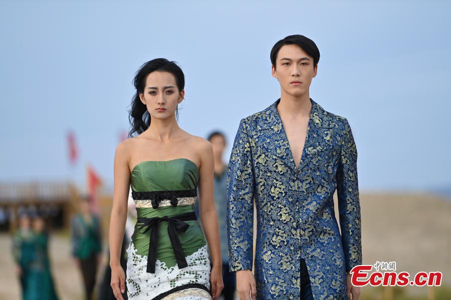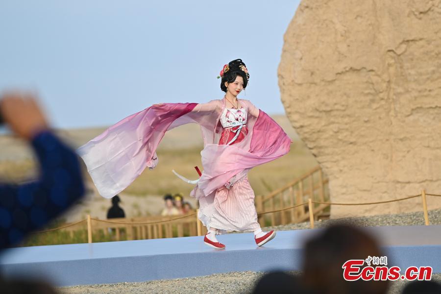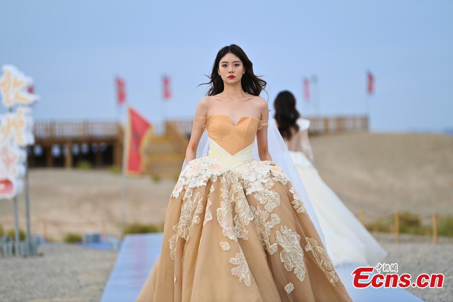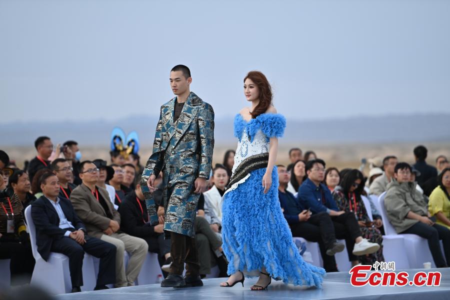 Models walk the runway during the 2023 Dunhuang International Fashion Week at Yumenguan Pass scenic spot in Dunhuang, northwest China's Gansu Province, Oct. 15, 2023. (Photo: China News Service/Li Yalong)