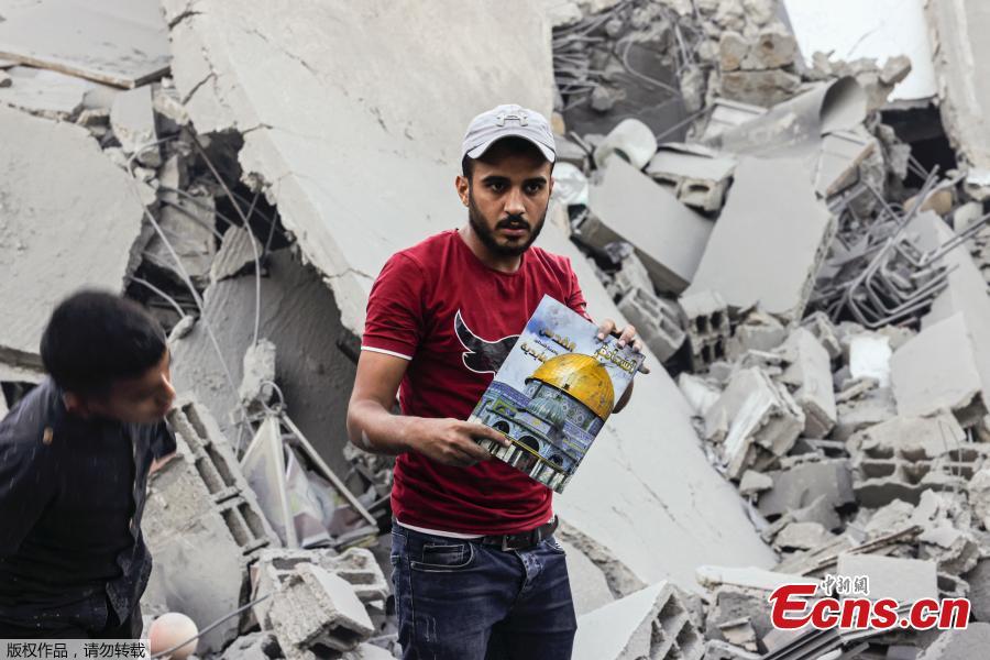 A man shows the cover of a magazine bearing a picture of the Dome of the Rock mosque, as he stands in front of a building hit in an Israeli strike on Rafah in the southern Gaza Strip, Oct. 15, 2023. (Photo/Agencies)