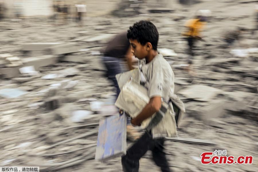 A child walks away with belongings salvaged from the rubble of a building hit in an Israeli strike on Rafah in the southern Gaza Strip, Oct. 15, 2023. (Photo/Agencies)