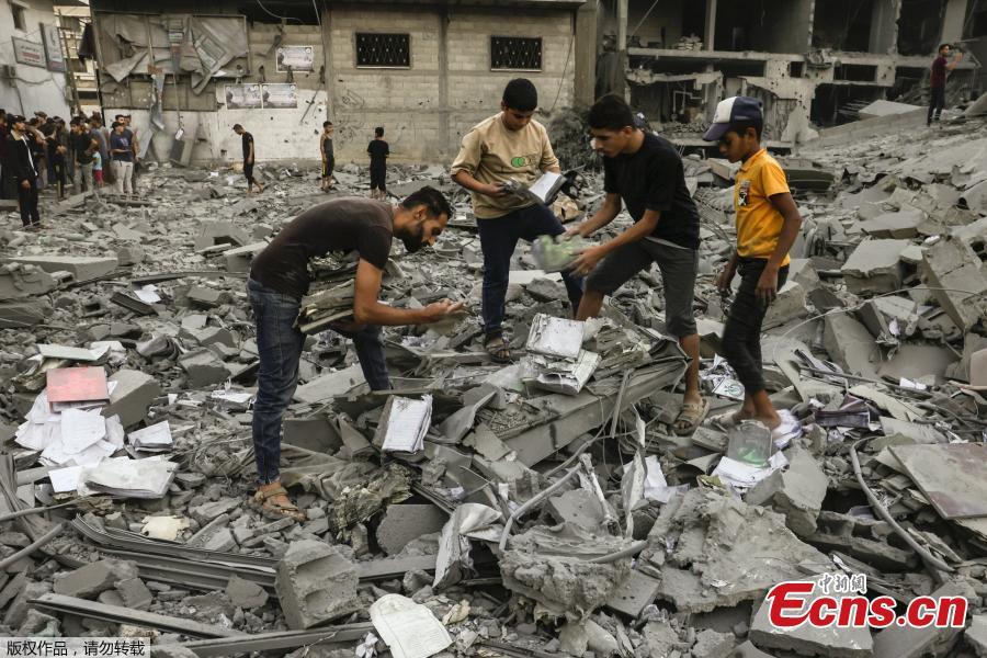 People salvage belongings from the rubble of a building levelled in an Israeli strike on Rafah in the southern Gaza Strip, Oct. 15, 2023. (Photo/Agencies)
