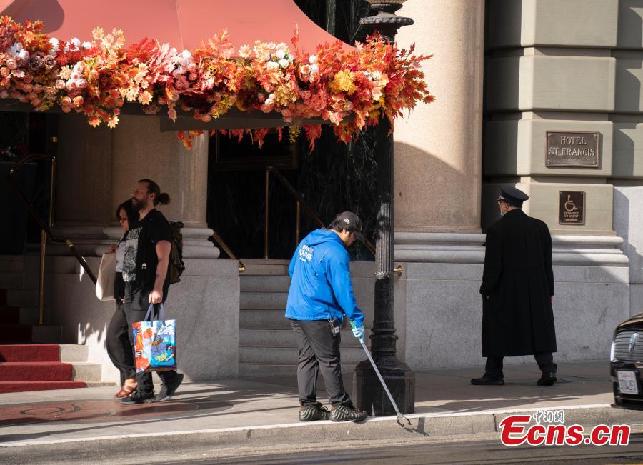 A sanitation worker cleans a street near Union Square ahead of the 30th Asia-Pacific Economic Cooperation (APEC) Leaders' Week in San Francisco, California, the United States, Nov. 13, 2023. (Photo: China News Service/Liu Guangan)