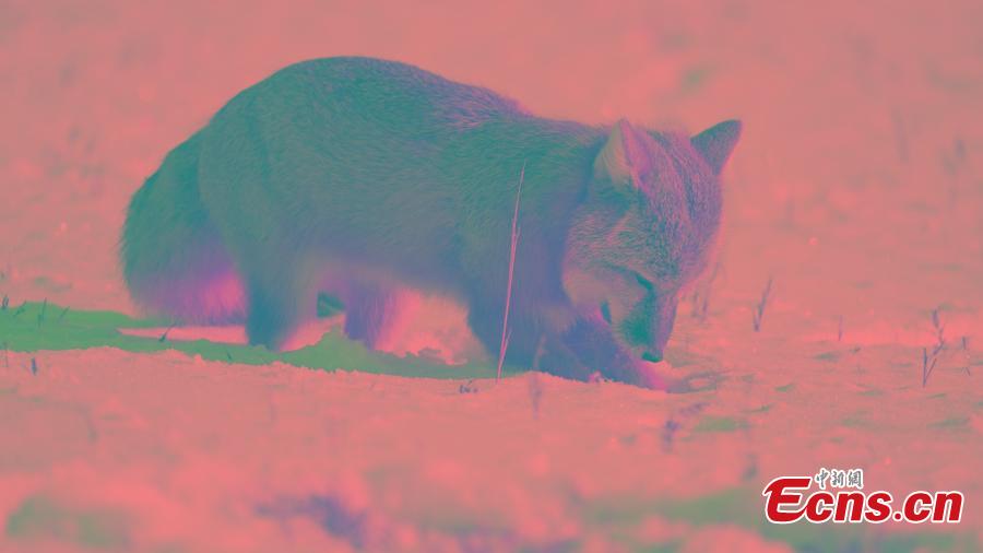 An endangered corsac fox buries food in snowfield, Inner Mongolia Autonomous Region recently. (Photo: China News Service/Liu Dong)