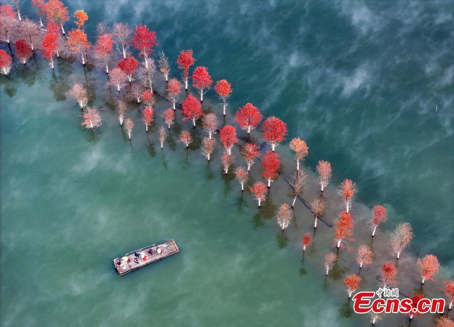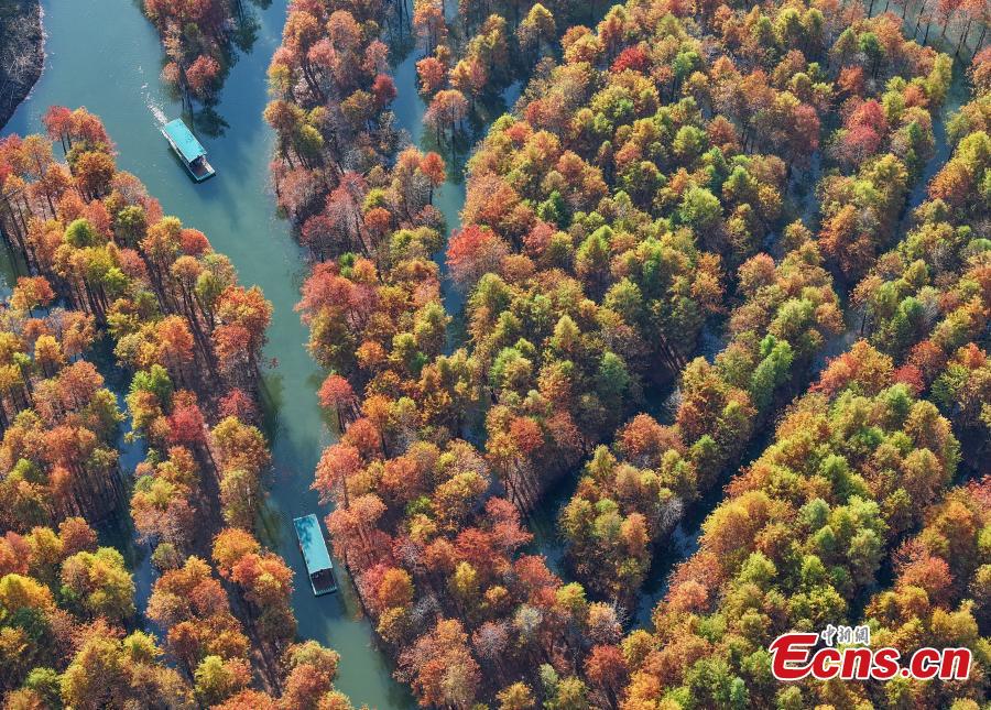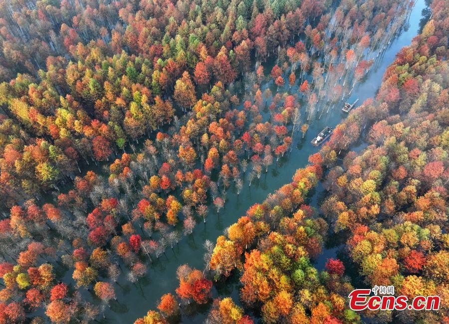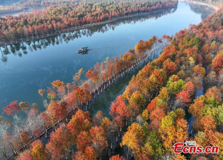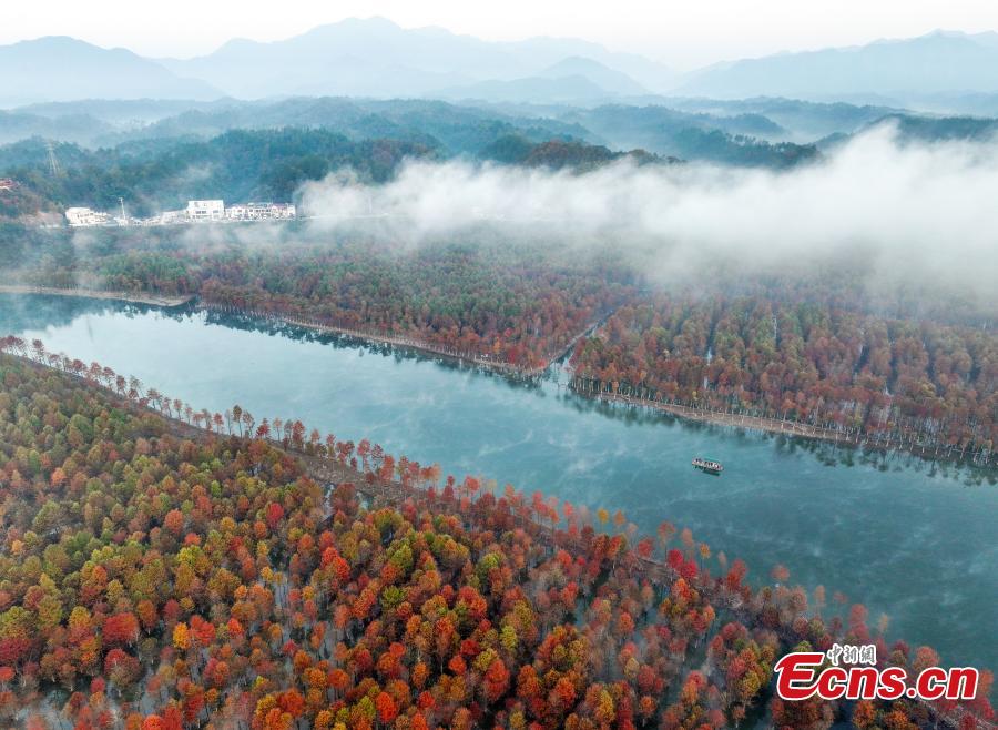 Tourists take bamboo rafts in colorful redwood forest in Qinglong Bay, Ningguo City, east China's Anhui Province, Nov. 14, 2023. The redwood forest Qinglong Bay turns the entire landscape into a virtual oil painting. (Photo provided to China News Service)