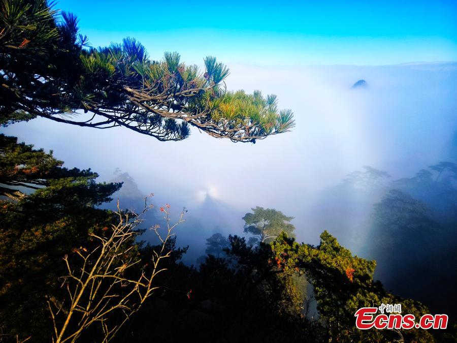 A solar halo is spotted over Mount Huangshan after a rainfall in east China's Anhui Province. (Photo: China News Service/Li Qin)